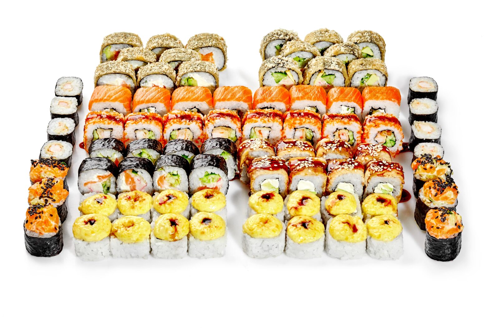 - Меню насчитывает более 200 позиций: роллы, сеты, пицца, суши-бургеры, горячие блюда и десерты.