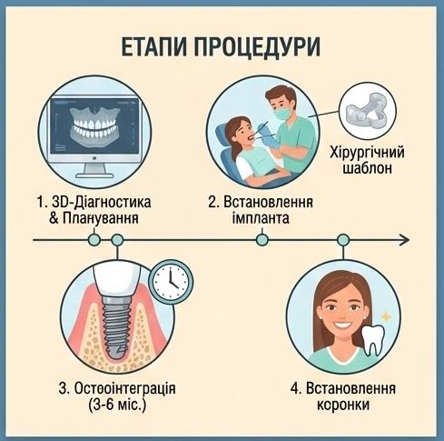 Час лікування Хірургічний етап триває 20-40 хвилин. Повне зрощення займає 3-6 місяців. Популярність набирають протоколи “Immediate Load” (зуби за один день), якщо дозволяє кістка.