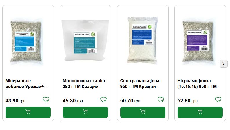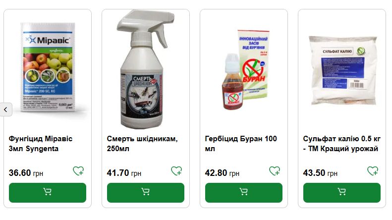 Цей портал — це по-справжньому великий агромаркет. Основа асортименту — це товари для землі та рослин. В каталозі легко віднайти потрібний фунгіцид (наприклад, «Страж» за 9.30 грн або «Хорус» від Syngenta за 29.10 грн), інсектицид, гербіцид або ефективне добриво. Тут представлені як популярні бренди, так і власні торгові марки, такі як «Кращий Урожай» або «Вихор». Це означає, що клієнт отримує якісний продукт без переплати за ім’я.